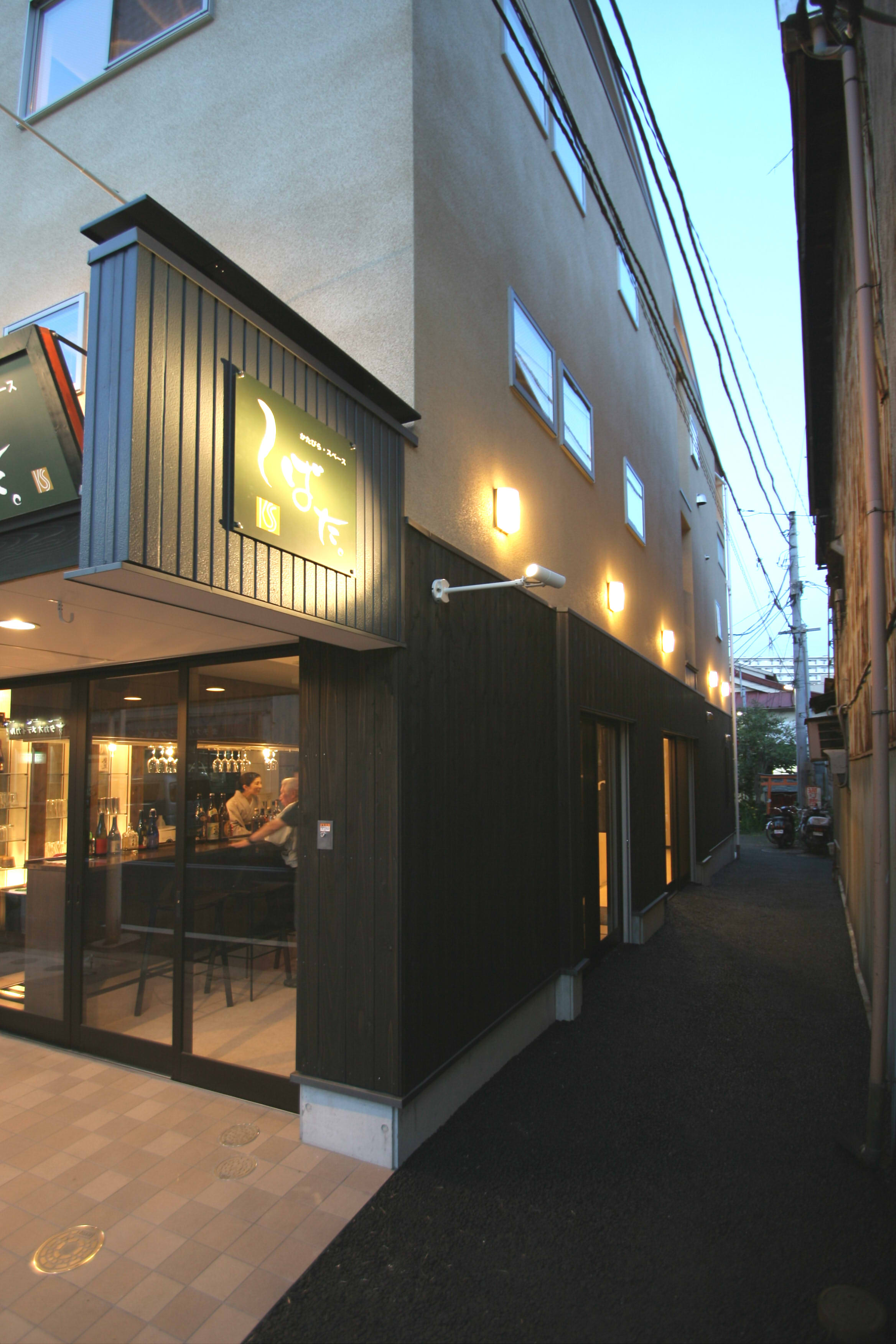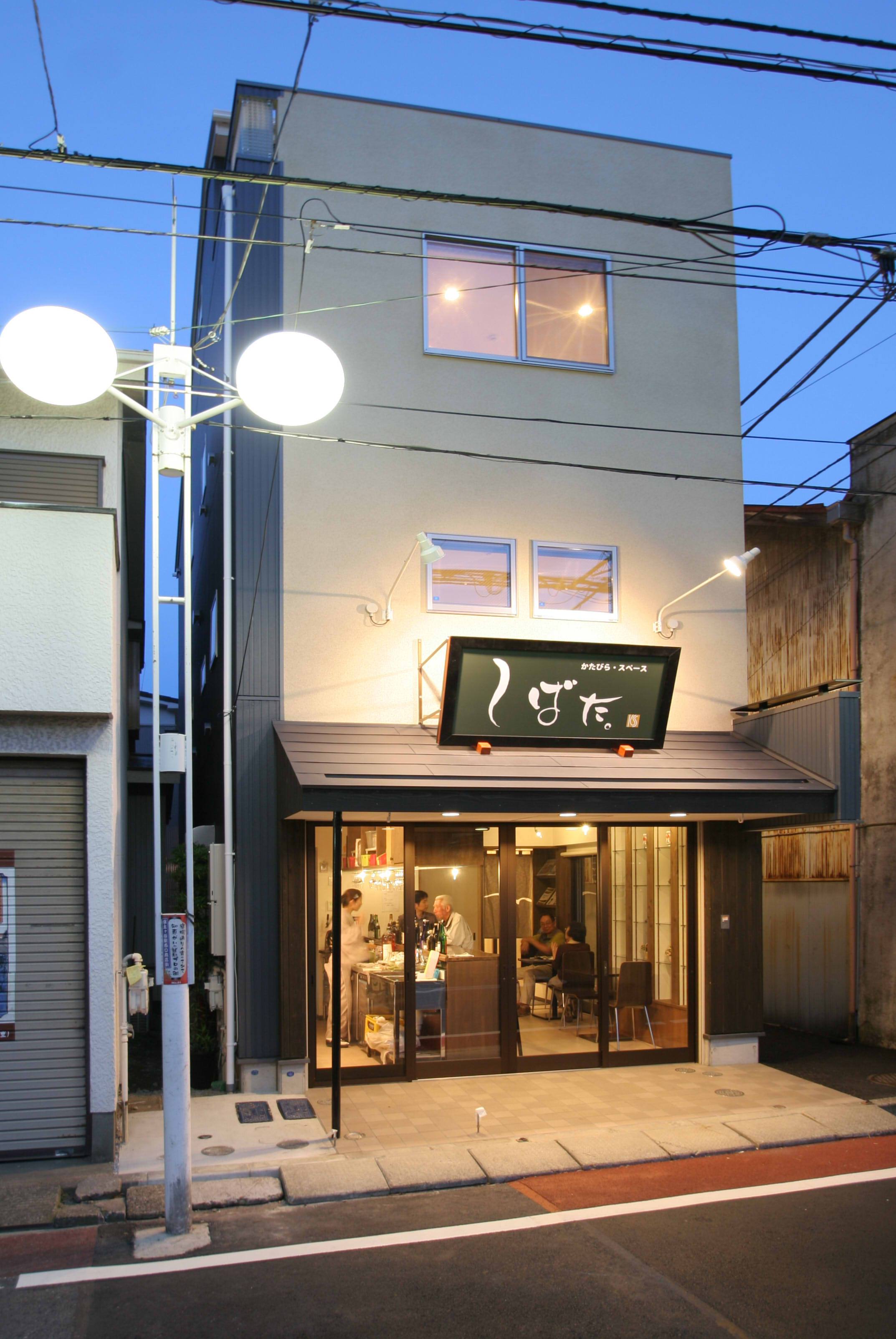 1階はカウンタバー+フリースペースで現代のまちづくり活動の拠点として多用途に活用できるように計画。2,3階のオーナー住居は狭あいな敷地周辺環境の中で通風や採光を効率よく得られるように、トップライトや吹抜け、ハイサイド窓等を活かした空間構成とした。キッチンはダイニングテーブル一体のオープンアイランド形式とした。また、敷地裏手にある銭湯へと続く路地への出入口を設け、照明も配して路地の魅力も向上させつつ店舗空間との一体的な回遊性のある空間を実現した。